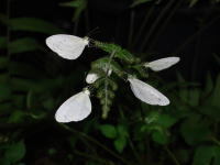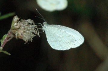 チョウではめずらしく日陰を好み、他のチョウがあまり活動しないくもりの日でも観察できます。とまっているときは、名前の由来である、翅の内側の黒い点は見ることができませんが、近くを飛んでいるときが、その点を見るチャンスです。また、草に集まって眠る習性があり、夕方に、まるで白い花のような姿を見ることもあります。小さくてとてもかわいらしいチョウなので、大温室でぜひ見つけてくださいね。
