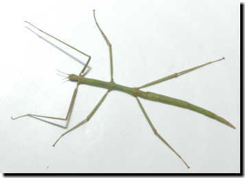 体は細長く、色も暗褐色から緑色まで様々で、木の枝に擬態しています。日本では八重山諸島に分布し、林縁や茂みに生息しています。夜行性でアカメガシワなどの葉を食べます。