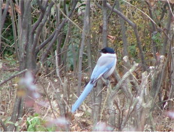 名前の通り尾が長く、羽と尾の水色が美しいカラスの仲間です。森林や竹林を好み、人の生活している場所でも、一年を通じて観察できます。群れで生活しており、いっせいに飛び立つ姿がよく見られます。雑食で、昆虫や果実、種子などを食べ、秋から冬には柿や木の実があるところでよく見かけます。頭は黒い帽子をかぶったように真っ黒ですが、幼鳥の時は白い毛が混じっています。