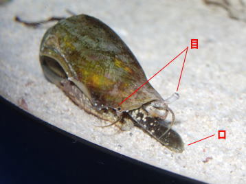 マガキガイの口はとても長く、その先にある小さな歯で、海藻などをけずりとって食べます。実際に水槽の藻類を食べている様子は、まさしくそうじ機のようです。また貝にはめずらしい、大きくはっきりとした目を持ち、その目をゆらしながら、口をのばしてエサを食べている姿は、水そうの脇役とは思えないほど観察しがいがあります。マガキガイは動きが速い上に、同じ水そう内にはマガキガイの殻を背負ったヤドカリもいるので、だまされないようにじっくり観察してみてください。