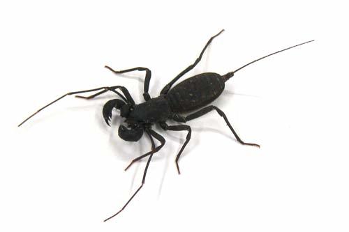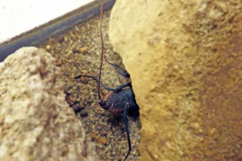 体の形はサソリにそっくりですが、サソリのように毒針をもつ尾はありません。代わりにあるのは細長い尾。怒るとこの尾をサソリの毒針のように立てて威嚇します。石の下に隠れていても、この尾は見えていることが多いので見つけてみてください。