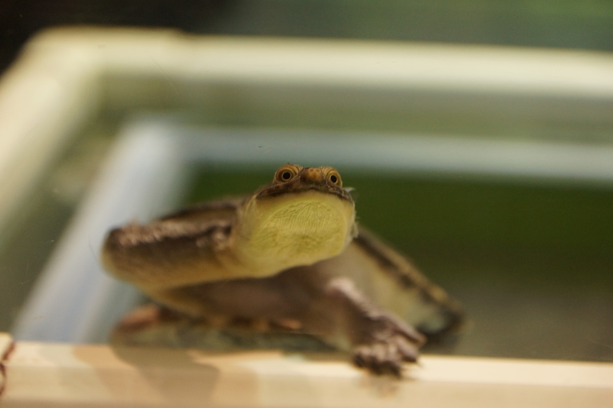 チリメンナガクビガメは魚食性のカメです。魚が近寄ったときには、首をヘビのようにS字に曲げます。魚に狙いを定めたら、首をばねのように素早く伸ばし捕えます。首が長いため、魚はどこまでがカメの射程圏内か分からないのです。餌やり時、魚以外の餌を与えても同じような行動をするので必見です。