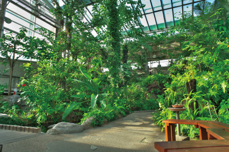 庭に草花を植え、野生のチョウを呼ぶ「バタフライガーデン」の展示です。テーブルとイスがあり休憩もできます。