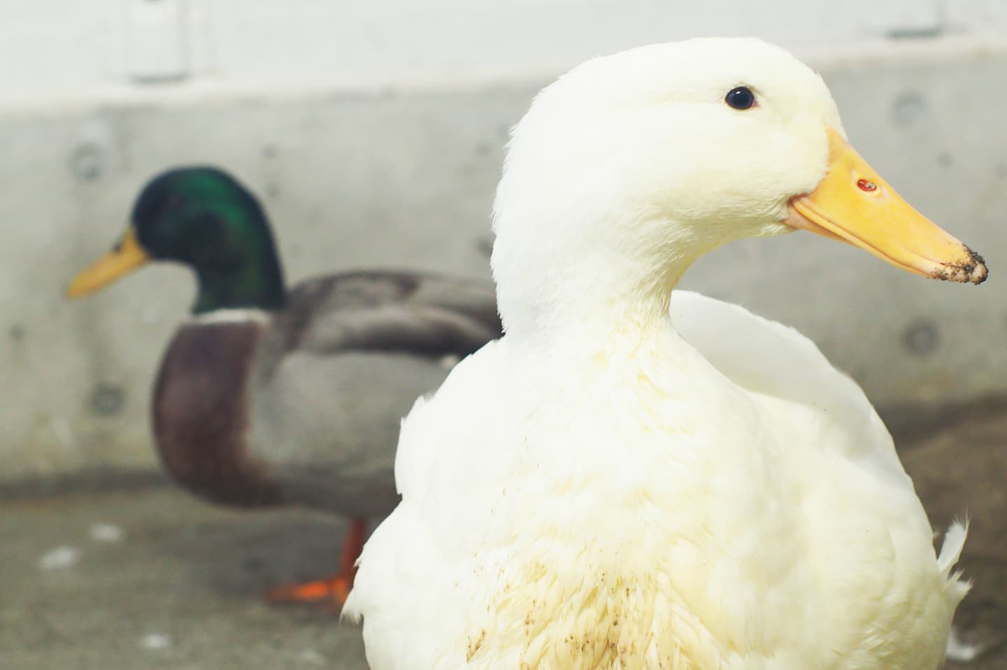 アヒルは、今から約3000年前に中国やヨーロッパでマガモを家禽(人間の生活に役立てるために飼育されている鳥)化して誕生したと言われています。体の色は、まるで違いますが同居しているアイガモとは実は同じ種類なのです。
