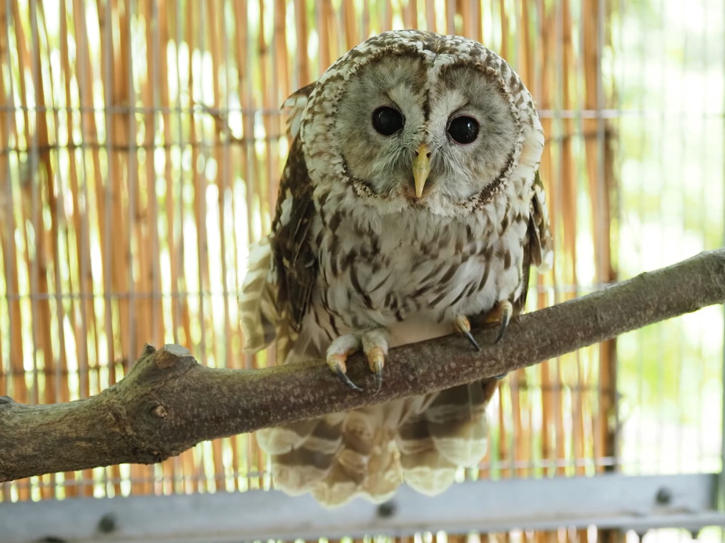 目が顔の正面についているため、距離を正確につかめる反面、視野が狭くなってしまいます。それを補うために首を左右に270度も回すことが出来ます。フクロウが起きていたら、鳥舎の前をゆっくり動いてみてください。首を動かす様子が観察できると思います。また、威嚇のために羽を逆立てたせて体を大きく見せたり、くちばしを咬み合わせて音をたてる様子も観察できるかもしれませんよ。