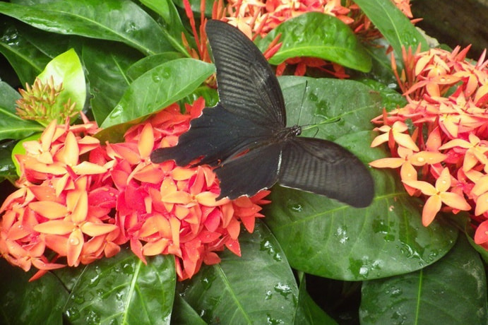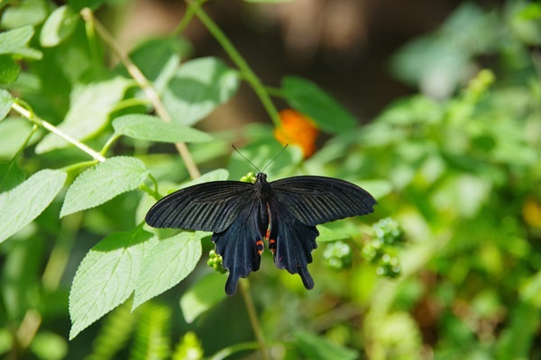 黒い翅を持つ大型のアゲハチョウの仲間です。北海道を除く本州から沖縄にかけて分布し、大温室だけでなく、生物園の庭園でも5月から10月にかけて、野生の個体が飛んでいるのを目にすることができます。