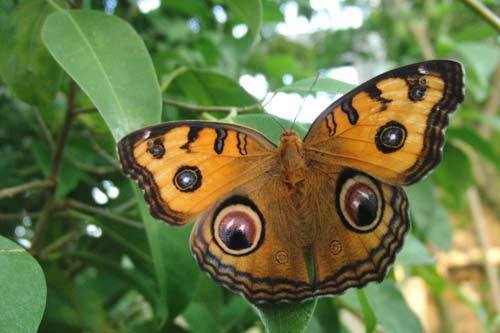 タテハモドキは、タテハチョウ科としては珍しく、翅を広げたまま留まることから「モドキ」と付きました。翅を広げた際に見える大きな目玉模様が特徴です。