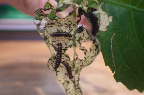 チョウの大温室に食草のスズムシソウが生えています。若齢幼虫は,食べ方に特徴があり、葉の脈を残すようにして食べます。また、幼虫が食べた部分は枯れて縮れていることが多く、目印になるので、探してみてください。
