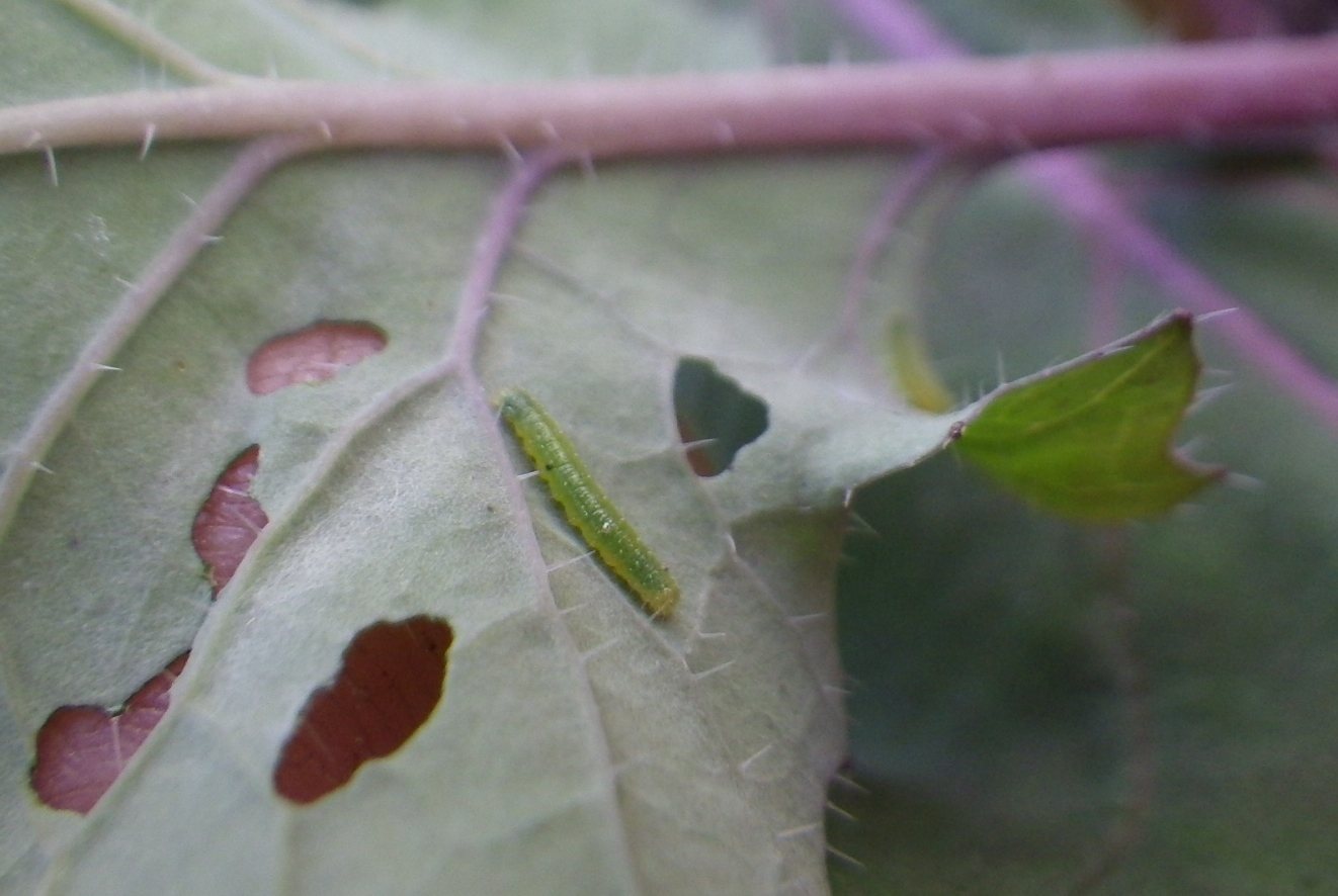 昆虫ドームには食草の一つである「菜の花」が植えられていますが、見ると葉にたくさん穴が開いたものがあります。これは幼虫の食跡で、新しい食跡がある葉をめくると小さな幼虫を見つけることができます。幼虫そのものは小さく目立ちませんが、周りの痕跡から探すと出会える生きものが増えるかもしれませんね。