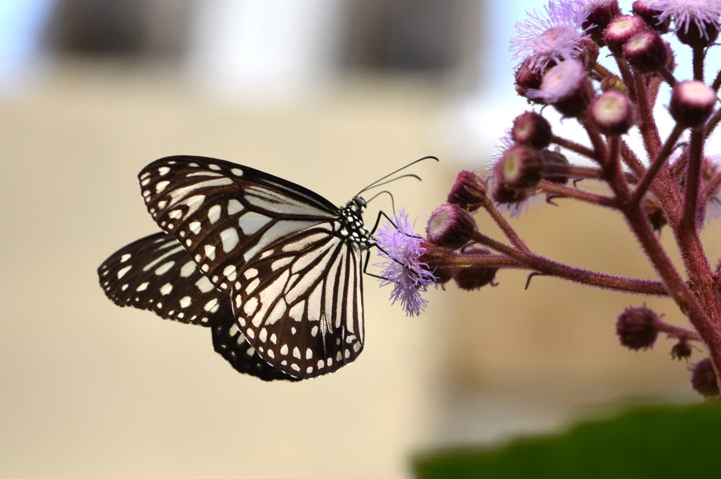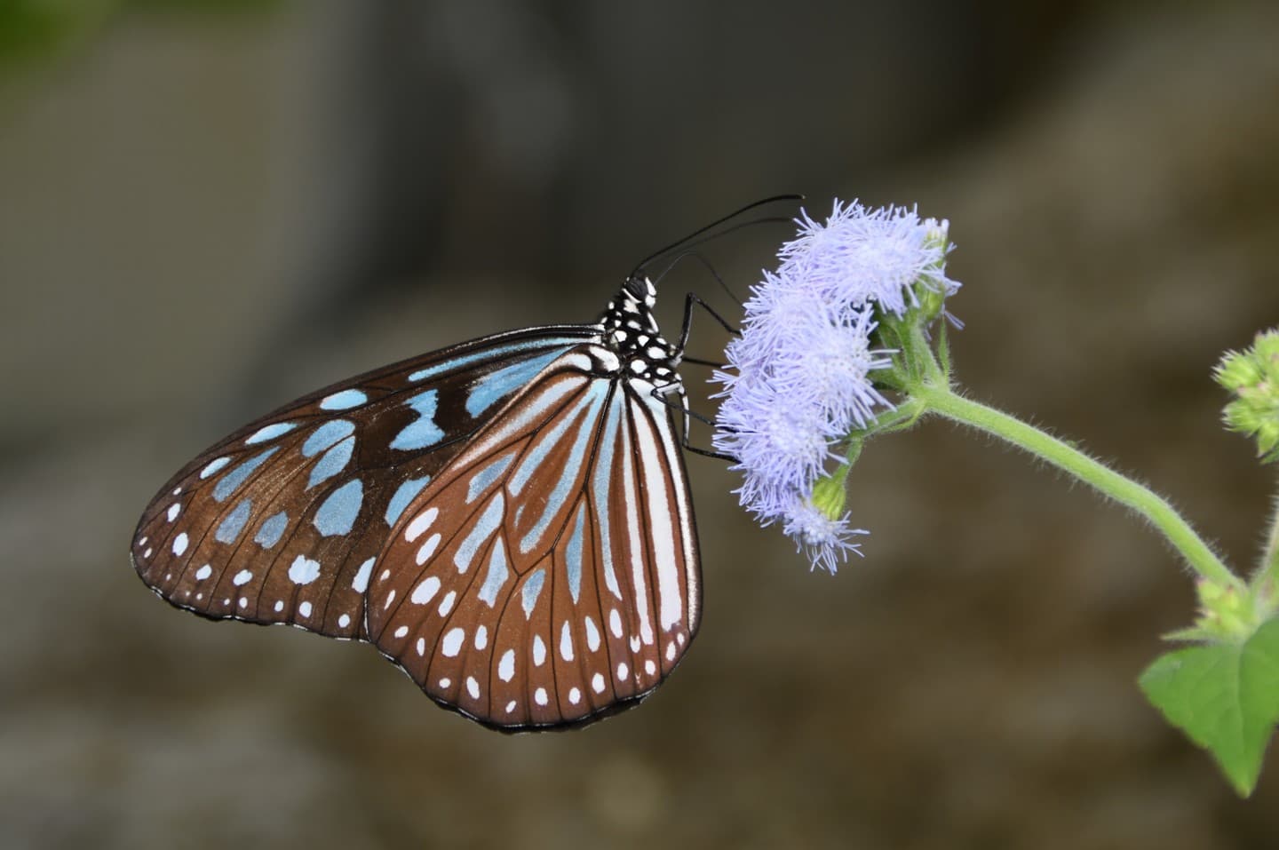 かつては迷チョウ(国内に生息していないが国外から自然に飛んで侵入したチョウのこと)で、現在は八重山諸島で見られます。幼虫はヨナグニカモメヅルなどキョウチクトウ科の植物を食べますが、生物園ではリュウキュウアサギマダラと同じツルモウリンカという食物を与えています。