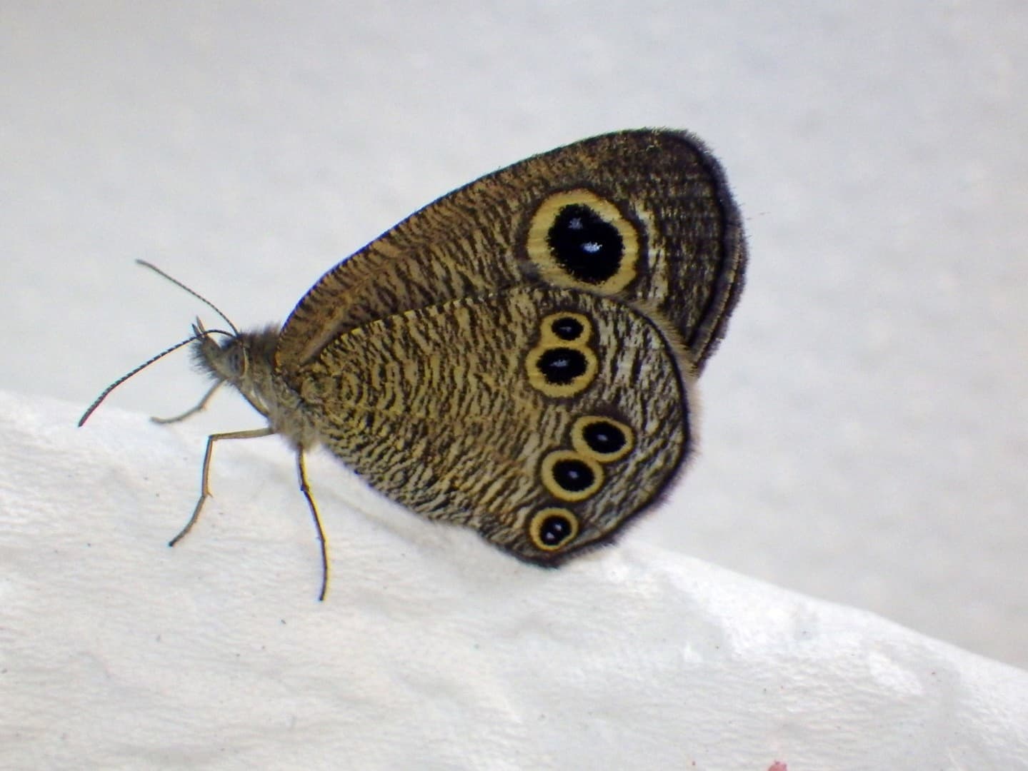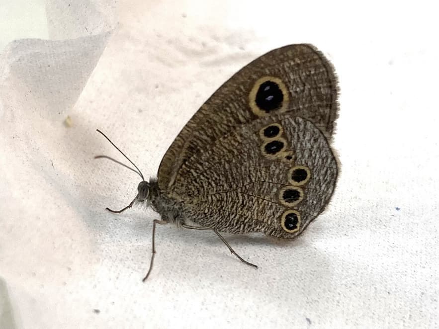 名前にある「ジャノメ」は「蛇の目」と書き、翅にある目玉模様のことをさします。この模様は眼状紋と呼ぶのですが、通常は後ろの翅の上方に2つ、下方に3つの計5つあります。