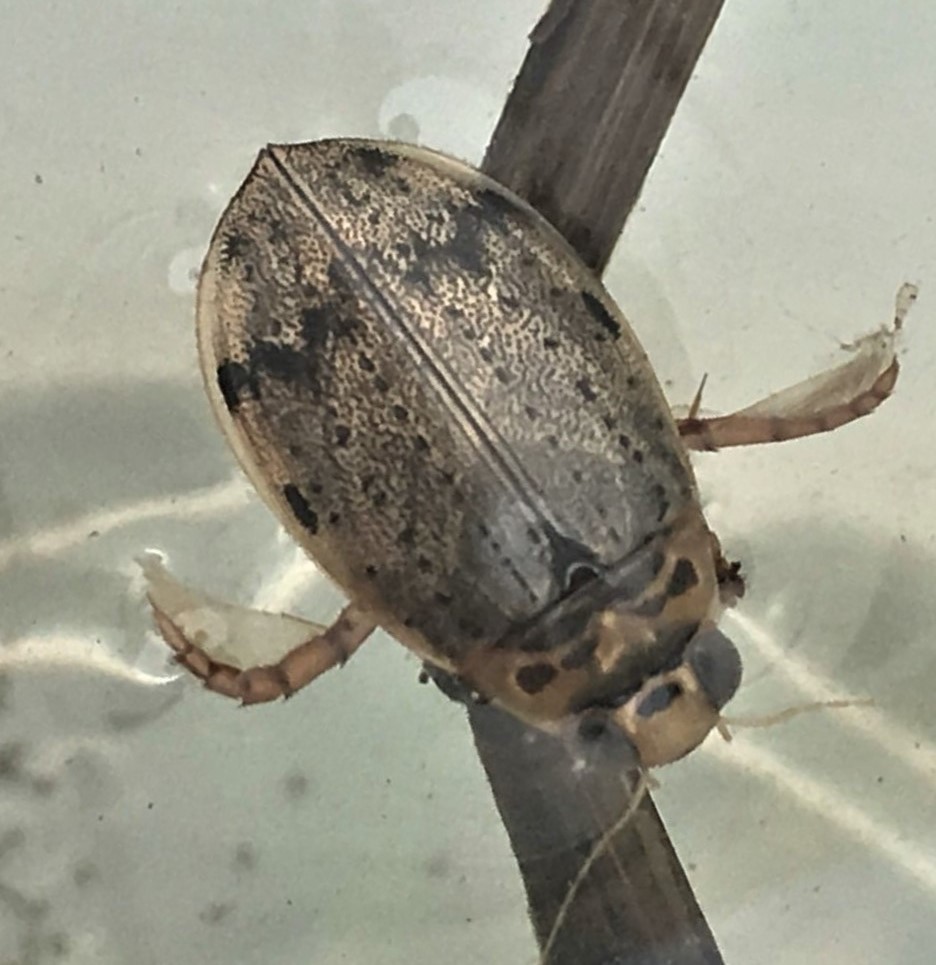 体長11~16mmのゲンゴロウの仲間で、日本全国に分布しています。池や水田などの止水域に生息し、足立区内では大きな水たまりや屋外プールで見られます。