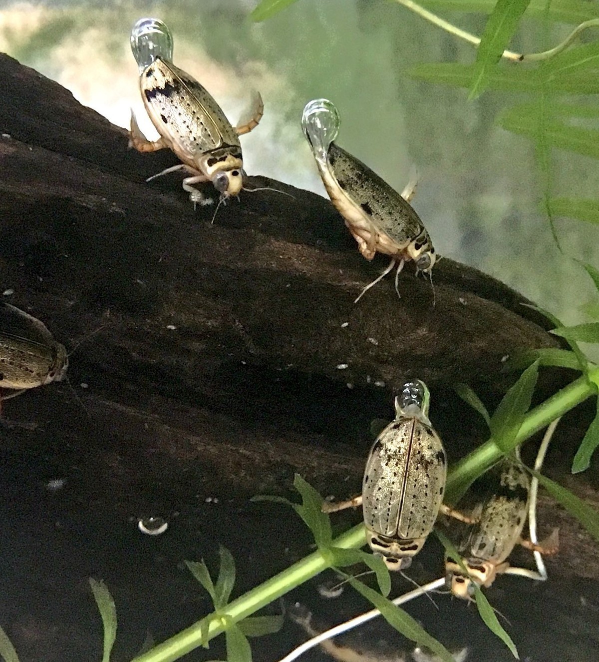 おしりの泡は、水中で呼吸を続けるための空気タンクです。ゲンゴロウの仲間は水中では翅と腹部の間に空気を溜めて、背面にある気門で呼吸します。体内から排出された二酸化炭素と水中の酸素が泡の中で入れ替わることで、水中で長時間呼吸をすることができるのです。
