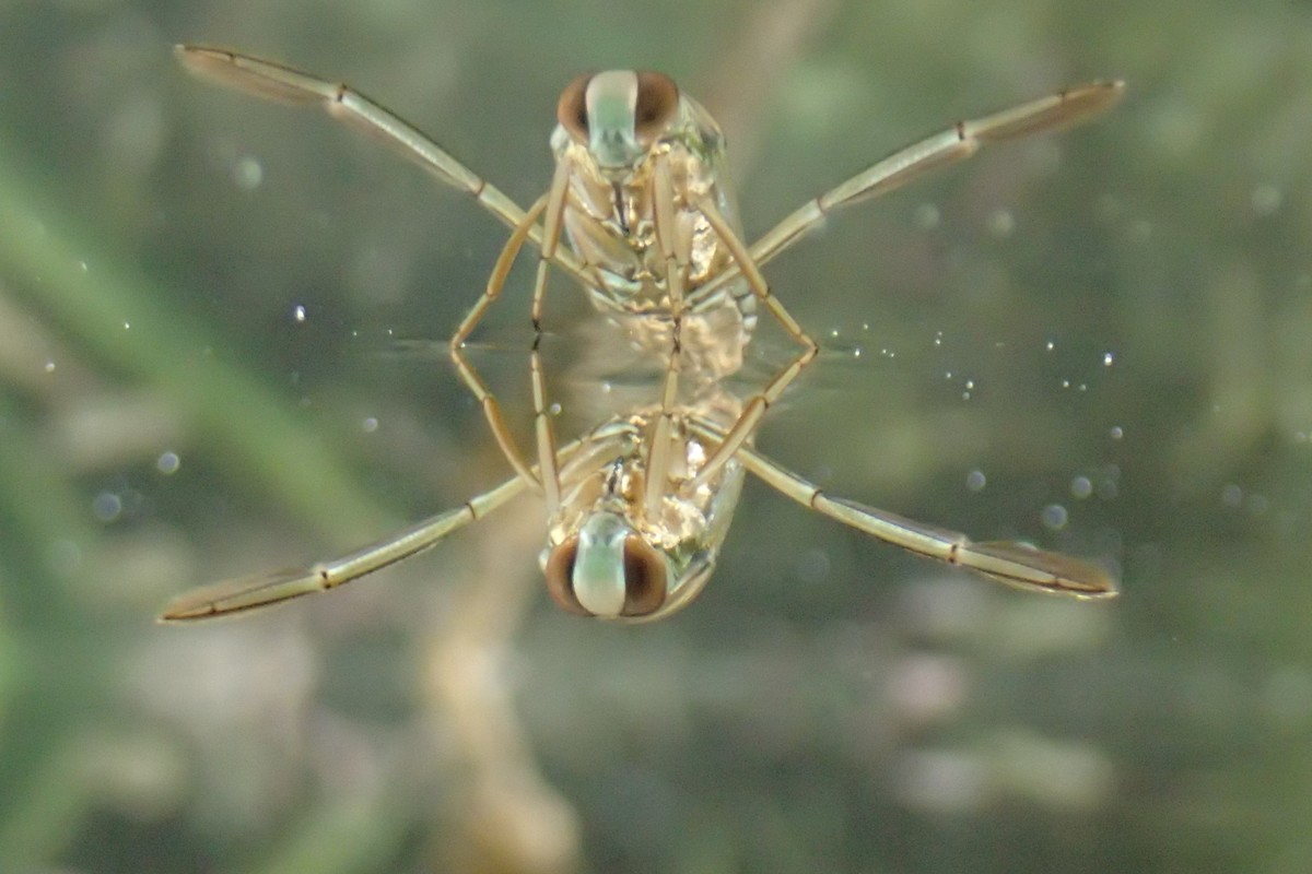 カメムシ目の昆虫で、体長11~14㎜。本州~九州に分布しため池など流れの緩やかな水場に生息します。水中の小型生物や、水面に落ちてきた昆虫などを食べます。