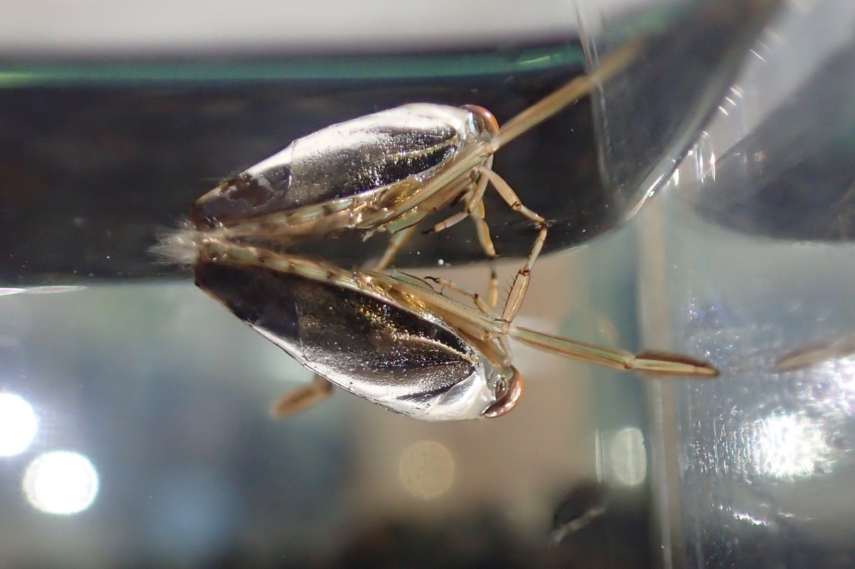 マツモムシの体には細かな毛が生えており、その間に空気を溜めることで水中でも呼吸することができます。空気を纏った身体は水中では銀色に輝いて見え、とてもきれいです。この空気の膜は呼吸のほかにも、浮力調整や体に汚れが付くのを防ぐ役割があります。ぜひ観察してください。