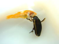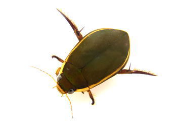 ゲンゴロウは、体長4センチほどの大型の水生昆虫です。田んぼや池などをすみかにし、水中を泳ぎ回って匂いをたよりに魚や昆虫を探して食べます。かつては日本全国で見ることができましたが、田んぼで農薬が使われたり、生息できる水辺が無くなってきたために、各地で個体数が減りつつあります。残念ながら、東京都や神奈川県では絶滅してしまいました。