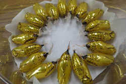 毒をもつため、幼虫の外見はとても派手です。 しかし、成長して蛹になると、黄金に輝く姿に変わります。外敵の鳥が金属光沢が苦手なため、蛹は輝くことで身を守れるそうです。蛹と幼虫はチョウの飼育室で展示しているので、ぜひ見てください。