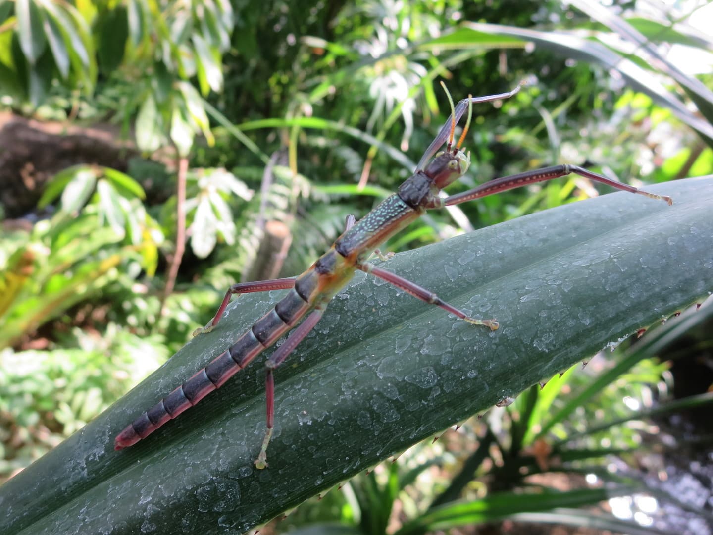 昼間はあまり動かないので、見過ごしてしまうかもしれません。特にアダンの葉のすき間に潜り込んでいると見つけるのはとても困難です。しかし、葉の根元や地面には粒状の植物繊維の塊がたくさん落ちています。これは糞です。糞を見つけられれば、その近くにきっとツダナナフシの姿を見つけることができるでしょう。運が良ければ、昼間でも葉をかじるのを観察できるかもしれません。動きが少ないからといって素通りせずに、じっくり観察してみてください。