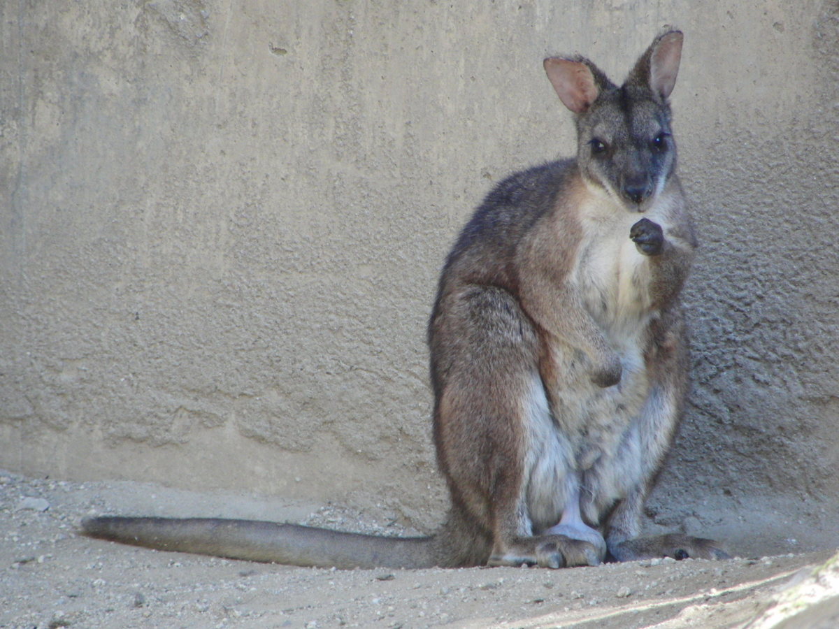 夜行性で警戒心が強いワラビーですが、お天気の日にはくつろいだ姿が見られます。尾には体を支えたり、バランスをとるために筋肉がついています。普段は後ろ足と尾の三点で支えて座りますが、くつろいで座るときにはなぜか自分の尾を跨いでおしりの下に入れます。腕を枕代わりにして横になることもあるので、ぜひ覗いてみてください。