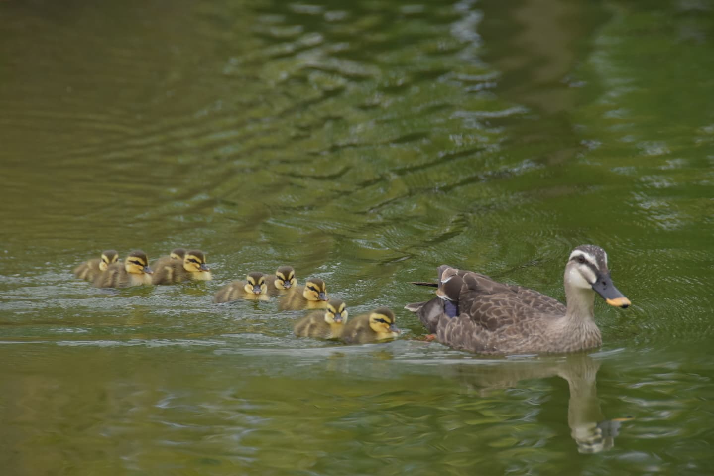 5月頃に餌を求め、池から草地に移動するカモの親子の行列が見られます。おぼつかない足で必死に親鳥についていくヒナはとても可愛らしいです。草地では、一心不乱に草や虫を食べている様子も見られます。