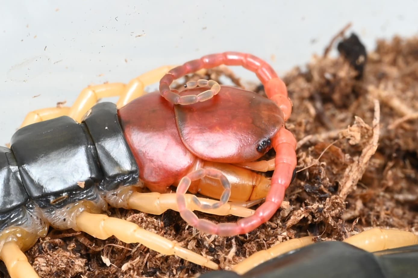 頭の付近をよく観察してみましょう。頭の次の節も鳶色をしており、この節から牙のようなもの(顎肢)が出ていることがわかります。ムカデが獲物を捕える時には顎肢を獲物に突き刺し、ここから毒を注入します。