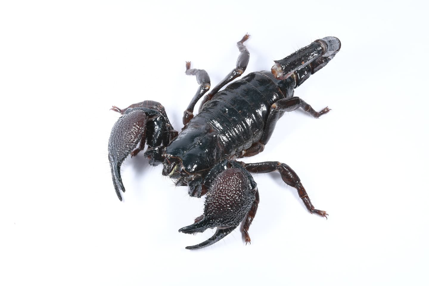 アフリカ大陸中西部の熱帯雨林に生息しています。体長は大きいと30cm程にもなるといわれる世界最大級のサソリです。尾の先に毒針をもっていますが、毒性はあまり強くなく獲物の捕獲には基本的にハサミを使用します。