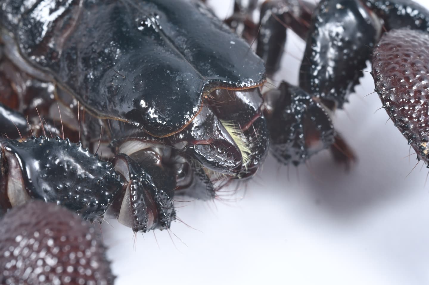 ダイオウサソリといえば獲物を捕まえるための大きなハサミが特徴ですが、実は口元にも小さなハサミをもっています。このハサミは鋏角といわれ、エサを細かくする役割をしています。人でいう歯のようなものですね。大きなハサミが生えている付け根あたりをみると、小さなハサミが2つあるのが見えます。ぜひ注目してみてください。