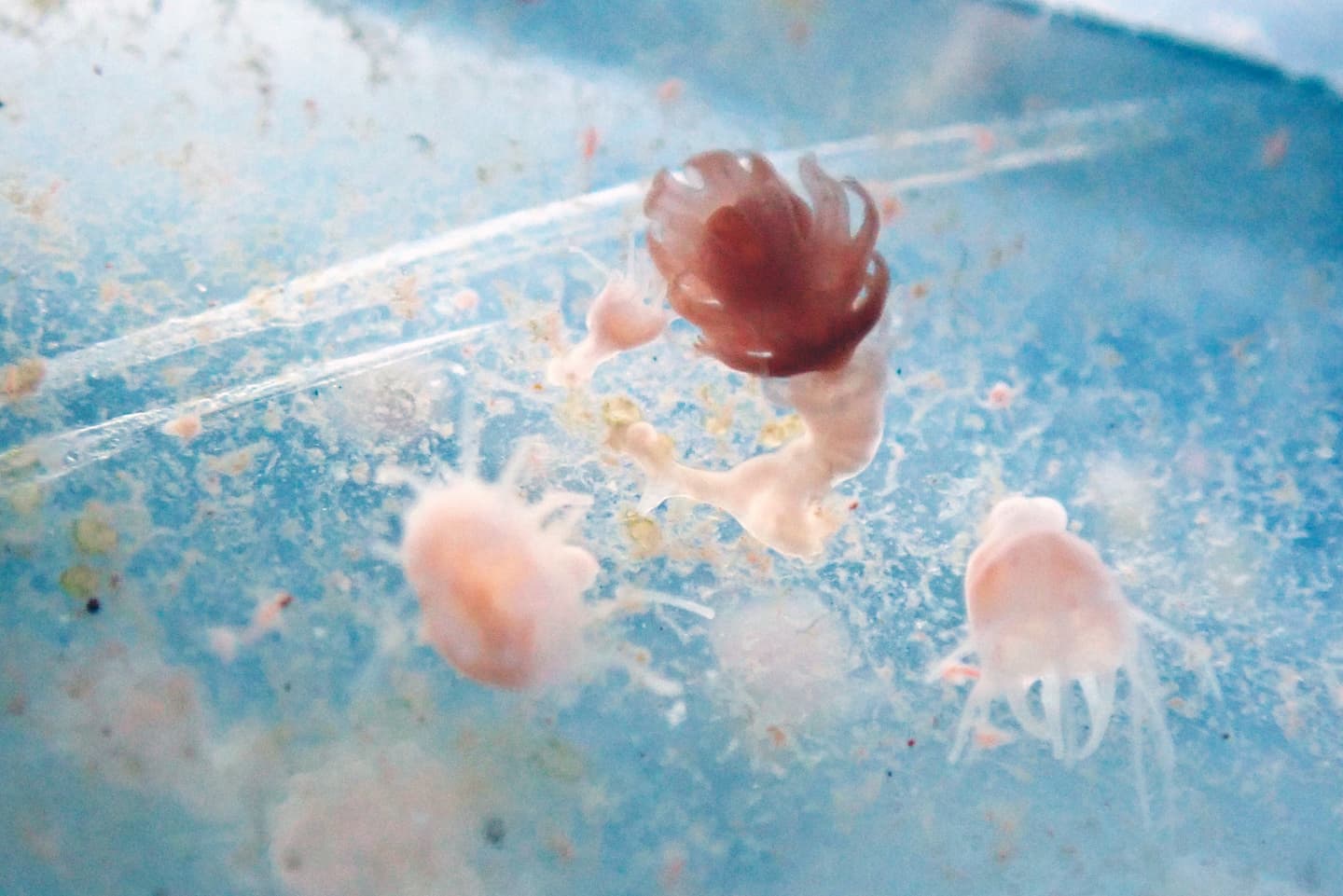ミズクラゲは日本の周辺で一般的に見られるクラゲの一種で、直径30センチほどにまで大きくなります。晩秋から初夏にかけて繁殖期を迎え、ポリプというイソギンチャクのようなものから遊離して成長します。