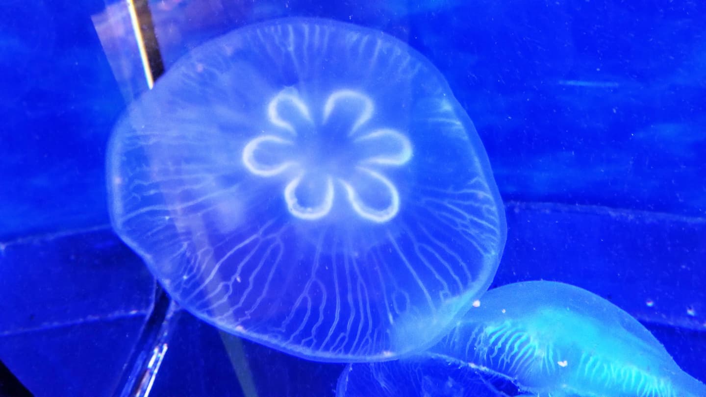 傘の中心部には四つ葉のクローバーのような模様があり、これは胃です。食べた物が透けて見えるため、その変化をみて飼育管理を行います。極まれにこの模様が、6つに増えた個体が生まれることもあります。クラゲは謎多き生きものなのです。根気よく通ってその目で探してみて下さい。
