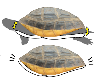 カメの仲間は甲羅の前後の隙間から頭や脚、尻尾を出し入れしますが、天敵から襲われる時はこの隙間が狙われます。本種は身を守る時に、腹甲の中央部が蝶番のように動くことで、この前後の隙間を完全に閉じることができます。近くに本種が来たら、隙間の構造をぜひ観察してみてください。