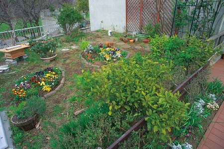 庭に草花を植え、野生のチョウを呼ぶ「バタフライガーデン」の展示です。テーブルとイスがあり休憩もできます。