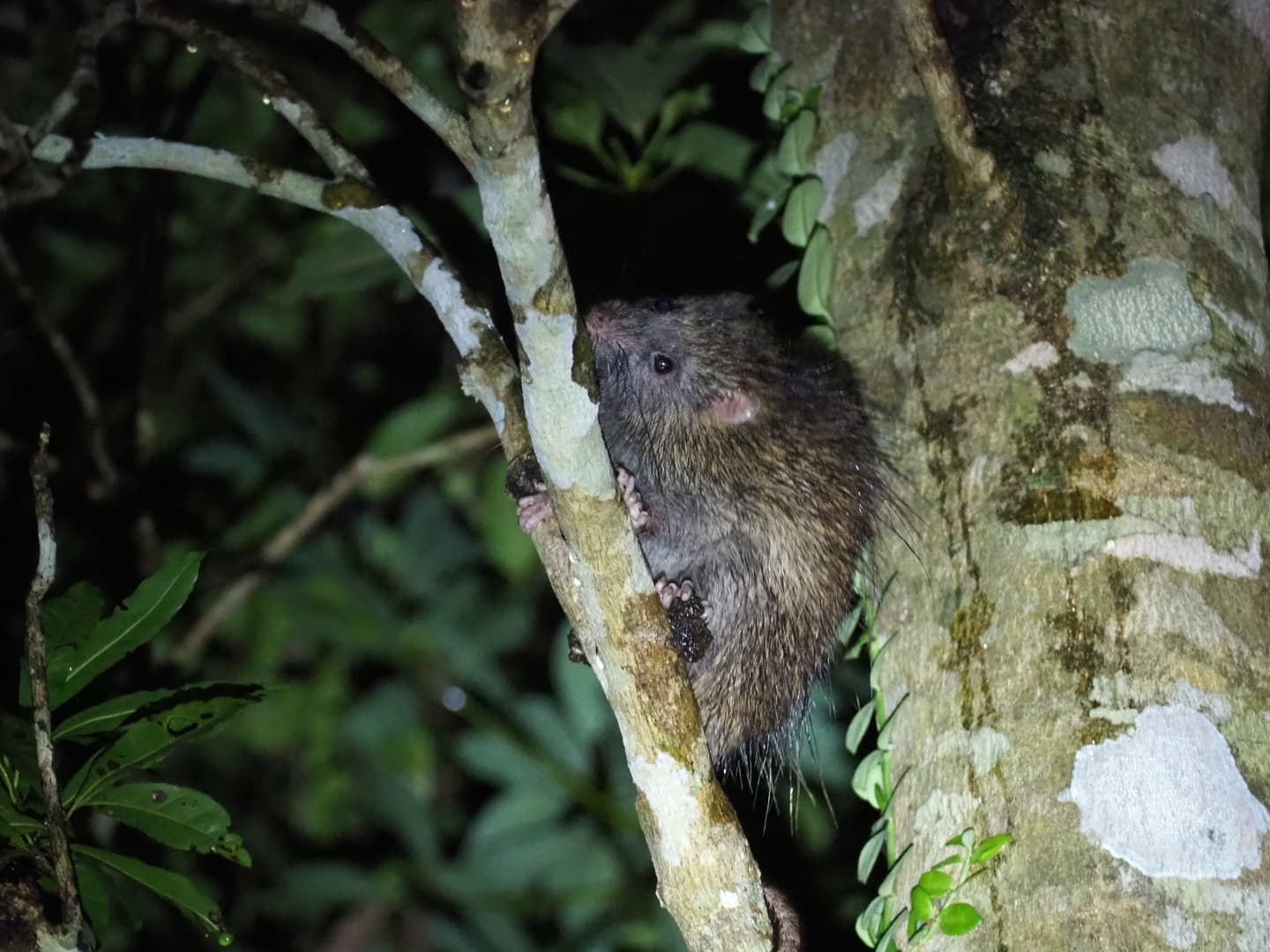 今年は大きいカメラ用ライトを購入してのチャレンジです。夜の林道を車でゆっくりと進むと、道路脇の木を登るケナガネズミを発見。どうにか撮影することができました。
