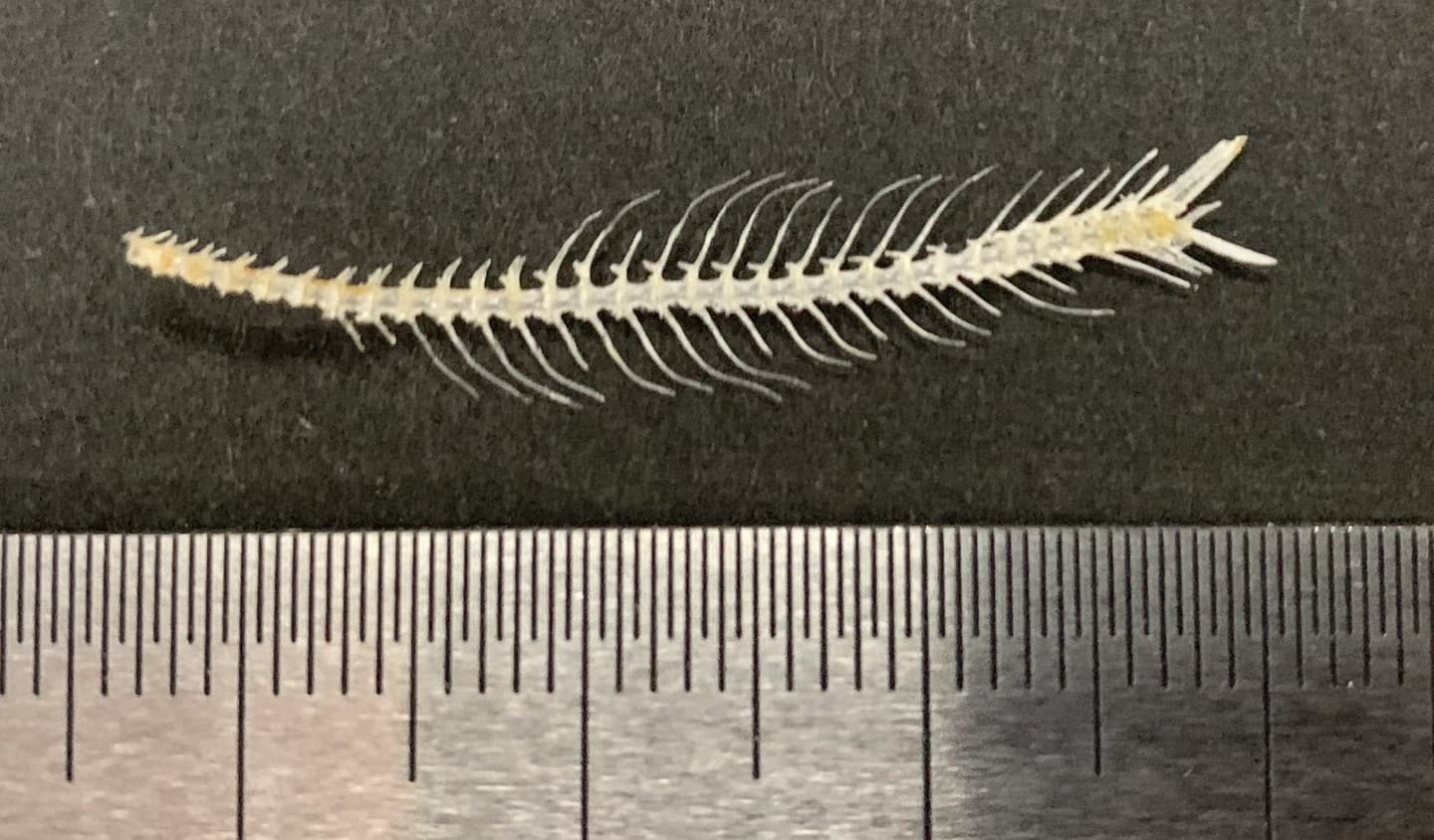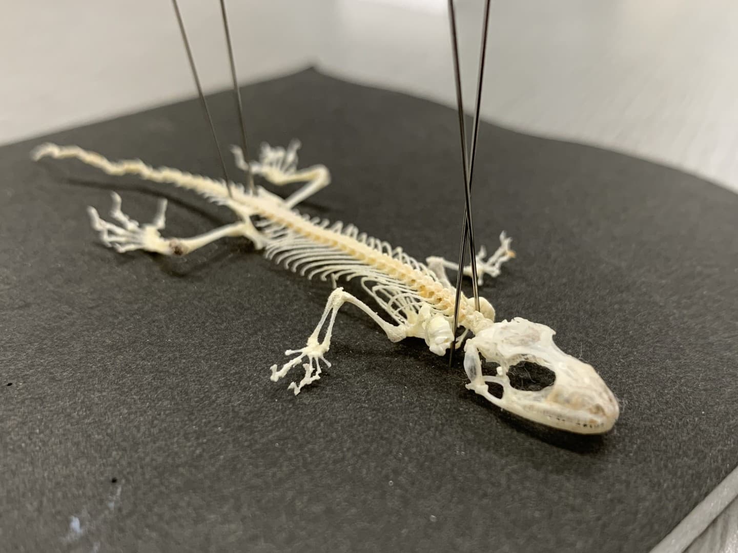 ミルワームには、ふすまや野菜、煮干しを与えています。煮干しを与えていて気づいたのですが骨を残して食べていました。これを見て骨格標本を作れるのではと思い、死んでしまったニホンヤモリで試してみました。体が大きいミルワームは、小骨も食べてしまうので、定期的に小さな幼虫に取り換えるなど工夫をしてみたり、仕上げの工程は骨格標本に詳しい先輩にアドバイスをいただいたりしながら行いました。自分でふと気づいたことから、実際に標本作りを行えたことはとても貴重な体験になりました。