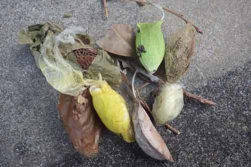 その中でもよく目立つのは、細い糸で紡がれた様々な色のガの繭です。
