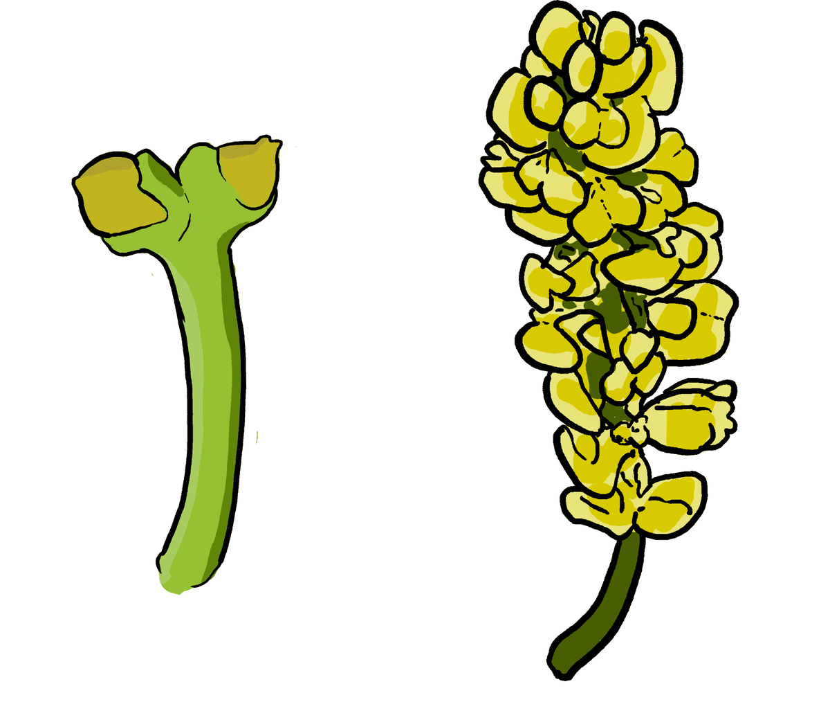 普段は気付かないのですが、イチョウの木にはオスとメスがあり、秋に実るギンナンはメスの木にしか付きません。実がなるということは花も咲きます。4月頃になると枝の先に小さな黄色の花を咲かせますが、面白いのはオスの木とメスの木で花の形が違うことです。オスは花粉を蓄えた房状の花、メスは先端に球が付いた形状をしていて、オスの木は風を使って、メスの木へ花粉を送ります。