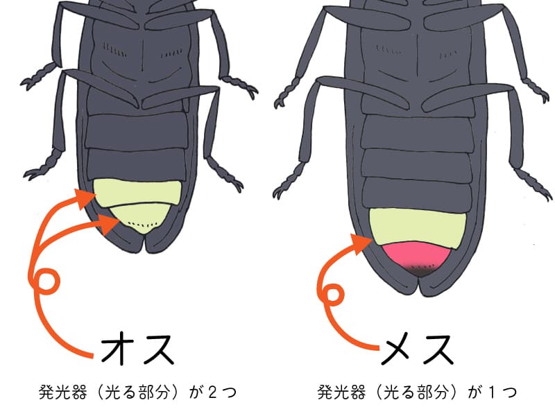 ホタルの雌雄は腹部の先端の発光器の「節」の数で見分けることができます。