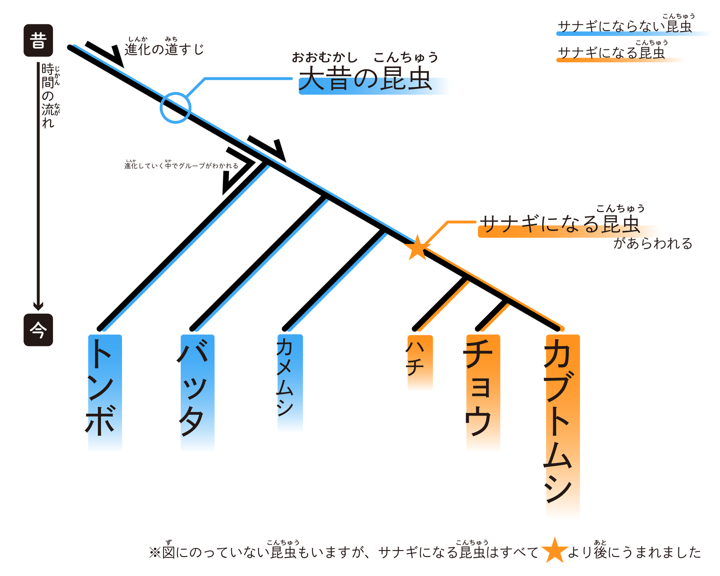 生きものは遠い昔から、少しずつ すがたを かえながら子どもをのこし、生きのこってきました(進化(しんか))。今回のしつもんも昆虫(こんちゅう)の進化の道すじにかんけいがあります。