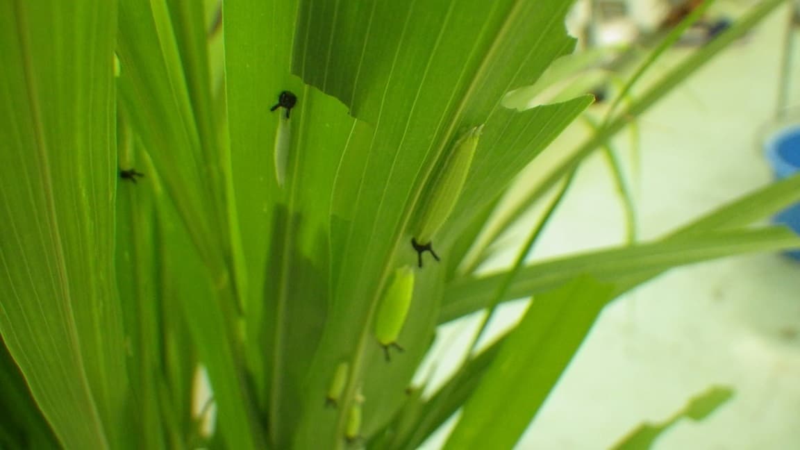 クロコノマチョの幼虫(ようちゅう)はススキなどのイネのなかまの植物(しょくぶつ)を好(この)んで食べています。エサは公園(こうえん)や河川敷(かせんじき)など色々(いろいろ)なところにあるのでさがしてみてください。
