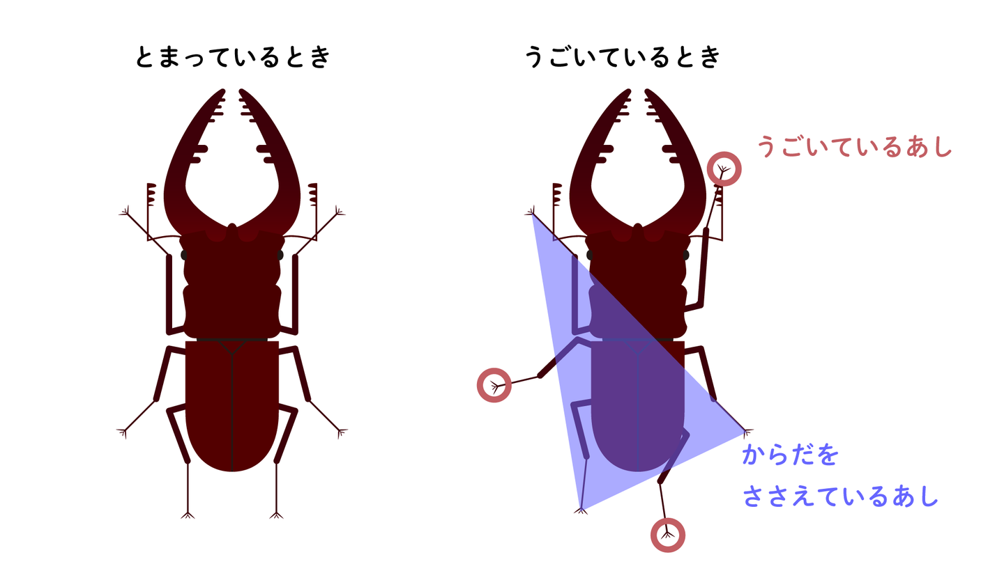 昆虫ははやく歩くとき、片側のまえあしとうしろあし、もう片方のなかあしの3本がセットになってうごきます。3本のあしをうごかしているとき、のこりの3本のあしは地面について体をささえています。