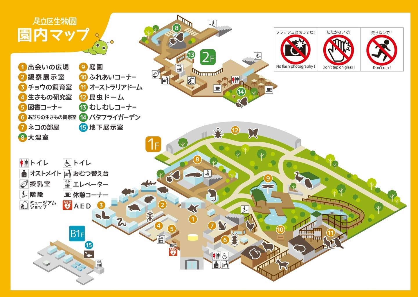 ※⑩ふれあいコーナーと⑪オーストラリアドームは、15:30に閉門いたします。