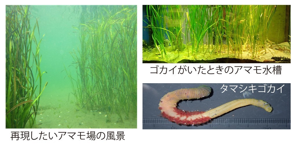 生物園では生きものの浄化能力に注目し、様々な生きものを導入して実験を行ったところ、ゴカイを入れた時に約2年間 植え替えせずに展示が出来ました。現在もアマモの飼育にどんな生きものが必要なのか、ひとつひとつ試しながら記録しています。