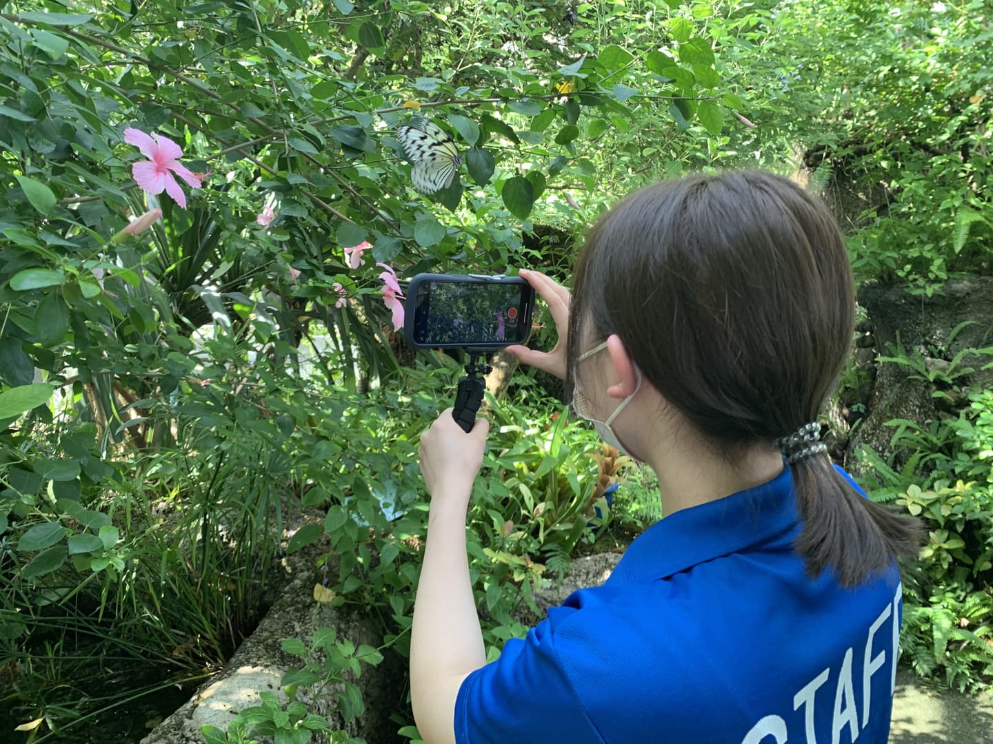 私はモルモットやヤギなどの哺乳類の飼育をしています。コロナ禍でモルモットのふれあいコーナーが中止になり、仕事内容がガラッと変わってしまいました。なくなってしまった作業もあれば新しい作業も増えました。それは生物園のYouTubeです。動画の編集が元々好きということで担当になりました。基本私が撮影、編集、投稿をしています。大変だったのは昆虫や魚、爬虫類など自分の担当ではない生きものの動画です。哺乳類以外は知識がないなかでの撮影・編集だったので、担当スタッフに何度も話を聞いて確認にとても時間がかかりました。編集する側の私が理解していないと見ている人にも伝わらないので理解を深めてから作成することで私自身とても勉強になります。YouTube担当になっていなかったら、色々な生きものの知識を得られないと思いました。これからも飼育とYouTubeどちらも頑張っていきたいです。