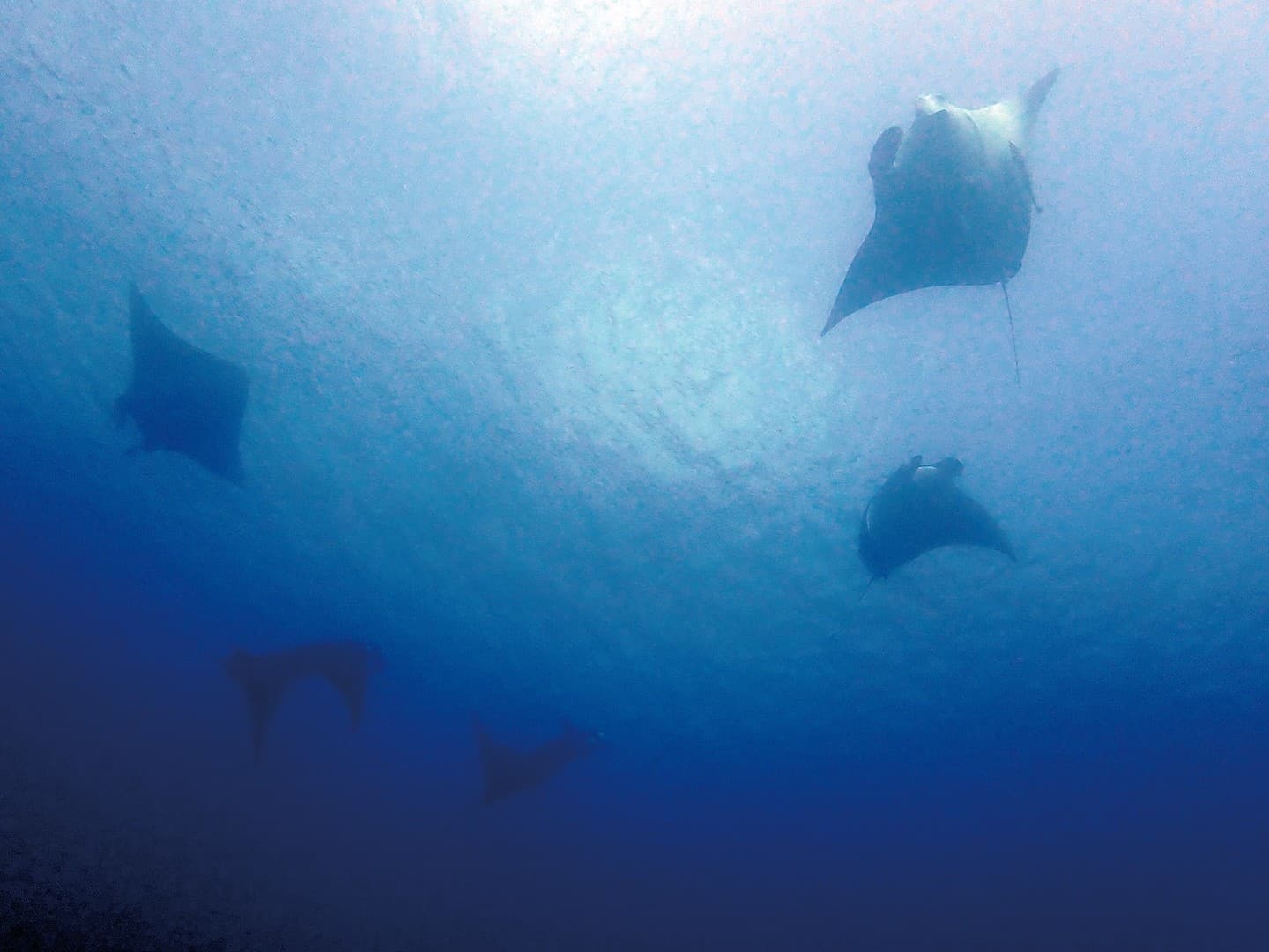 皆さんはマンタという魚をご存じでしょうか。マンタは迫力のある姿からダイバーにとって憧れの存在となっているエイの仲間の魚です。私はマンタと出会うために、沖縄県の西表島に行ってきました。しかし、西表島でも運が良くないとマンタには出会うことができないとのこと。幸運を祈りつつ、期待しながら潜りました。すぐに2頭のマンタに出会うことができ、夢中で観察をしていると、ガイドさんが興奮した様子で岩の向こうを指さしていました。なんだろうと思いながら付いていくと、目の前で5頭のマンタが列をなしてぐるぐると回っていました。これはマンタの繁殖行動なのだそうです。これほどの数のマンタを同時に見られることは非常に珍しいことらしく、ガイドさん共々、大興奮の1日となりました。