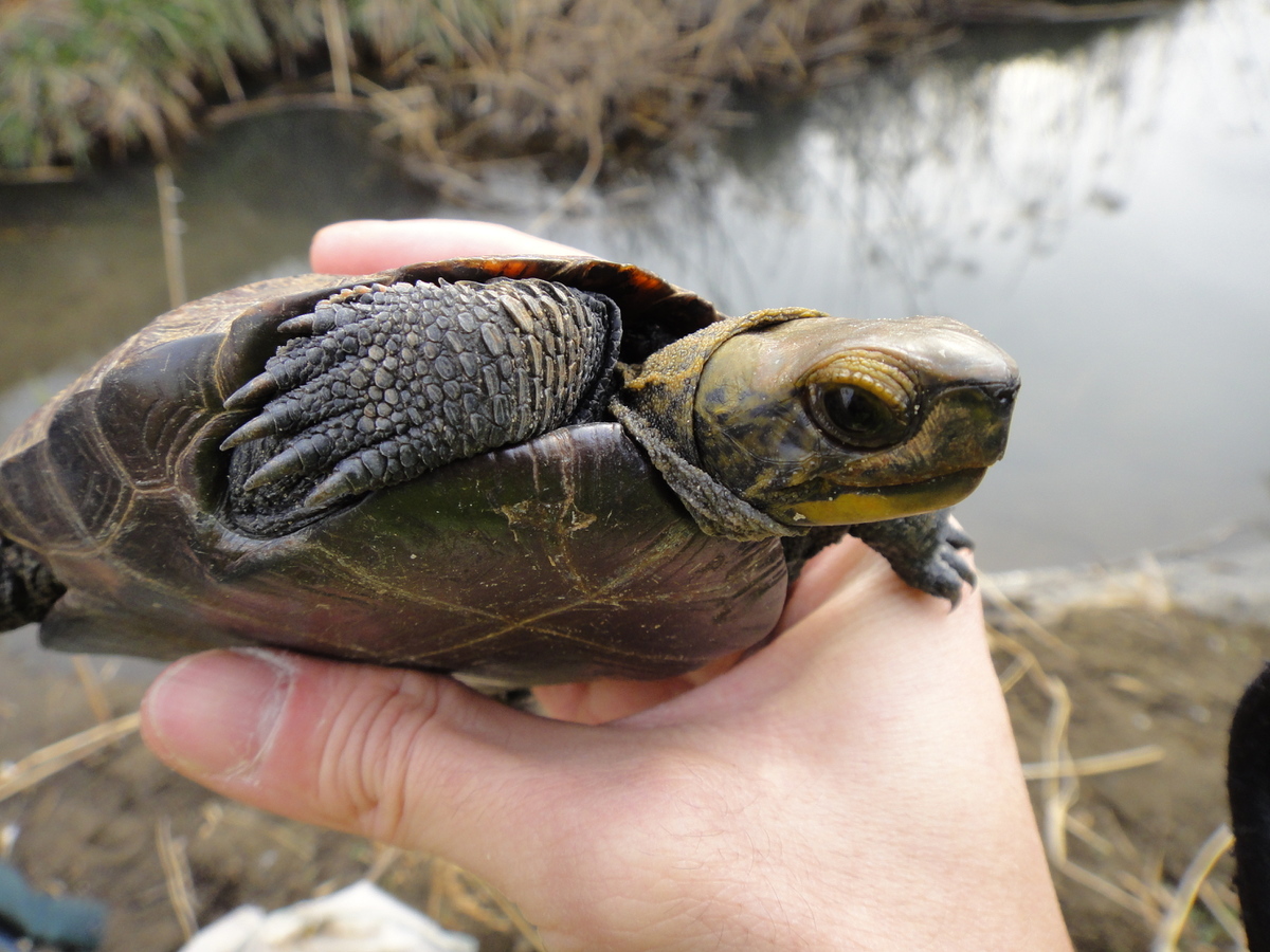 探し方はいたってシンプル。凍てつく川に入っていき、手探りで水底のカメを探します。長時間、指の感覚を最大限に研ぎ澄まし水中を探るので、この調査は何より寒いです!両手はかじかんで真っ赤になり、時には腰の深さまで川に入ることもあります。この時も寒さを我慢した甲斐あって、カメを発見できました。