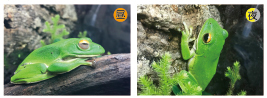 昼の彼らはじっと動かず、止まり木に腹や肢をピッタリくっつけたポーズで固まっています。物音がしても、他のカエルが乗っても動じない姿は可愛らしいの一言。また眼の形も、夜は大きな黒目が日中は細く変わり、別のカエルの顔のようでこれはこれで魅力的です。