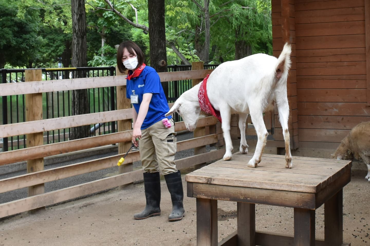 ヤギやヒツジのハズバンダリートレーニング(習性を利用した健康管理)の様子を解説付きでご覧いただけます。