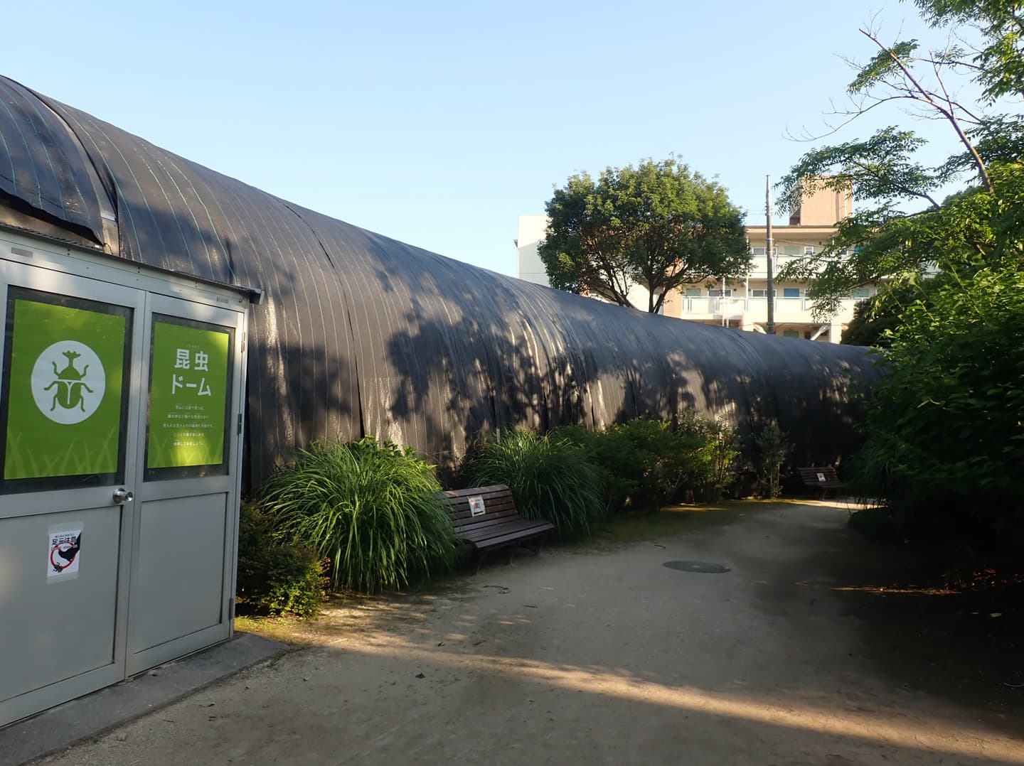 都市部は夜でも街灯に照らされ、これらの光はホタルにとっては明るすぎ、ホタル同士の光を使ったコミュニケーションにとって大きな障害です。生物園ではホタルの夕べ開催に合わせて、観賞で使用する昆虫ドームを黒い幕で覆い、自然界に近い暗い環境を再現しています。