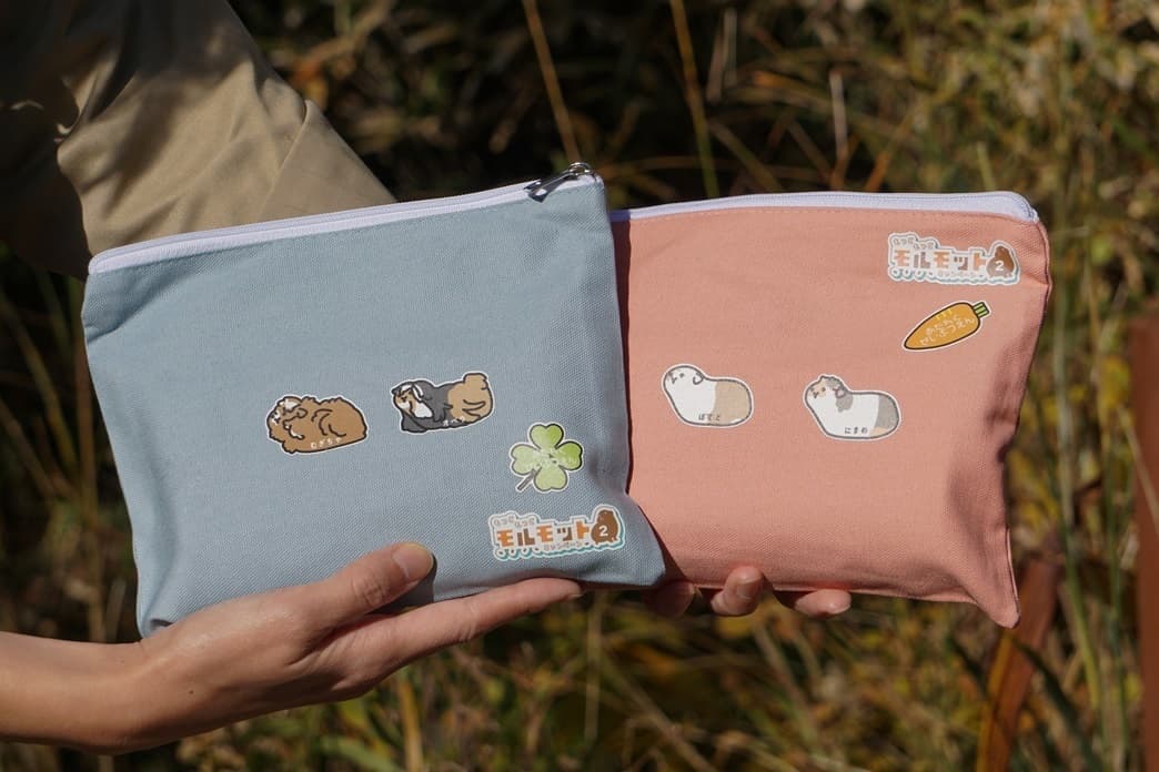 生物園オリジナルデザインのモルモットとごはんのプリントシールをポーチに貼り付けてオリジナルポーチを作ることができます。その場で完成、すぐにお持ち帰りいただけます。