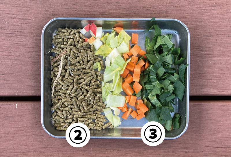 主食ではなく補食(おやつ)として与え、量は少量にします。こればかり与えてしまうと、お腹の調子を崩したり、歯が伸びすぎるなど健康を損なう原因となります。